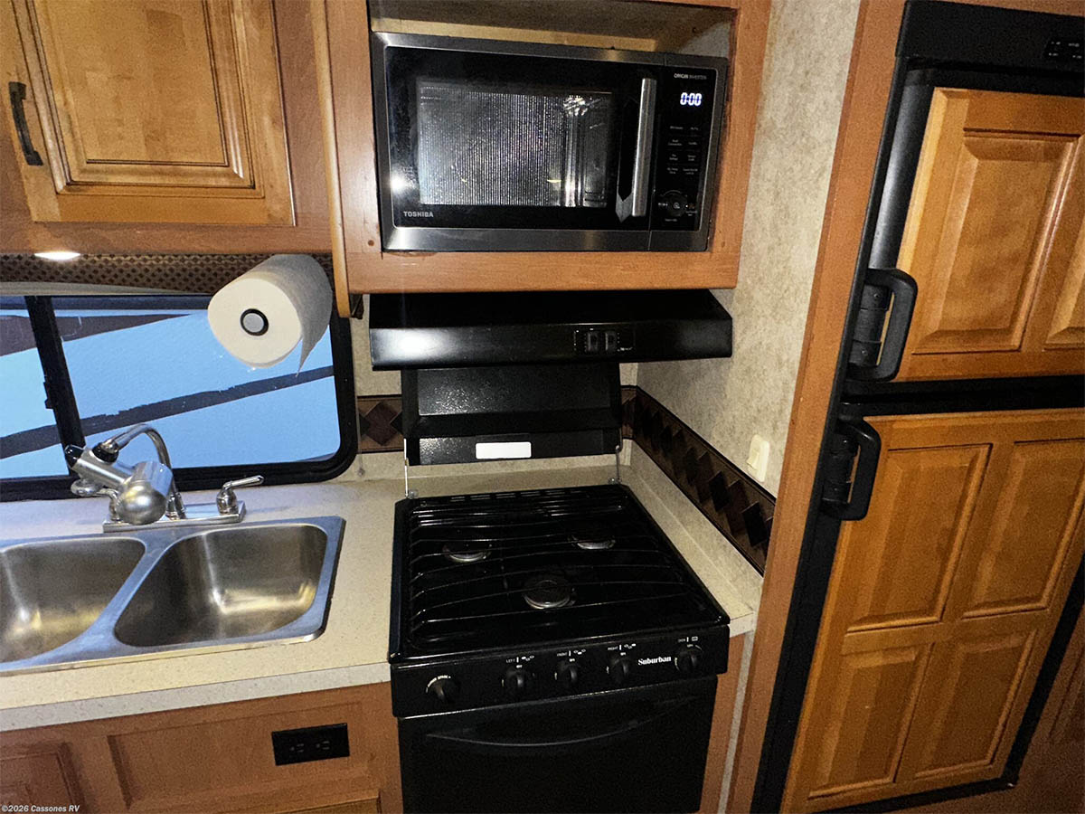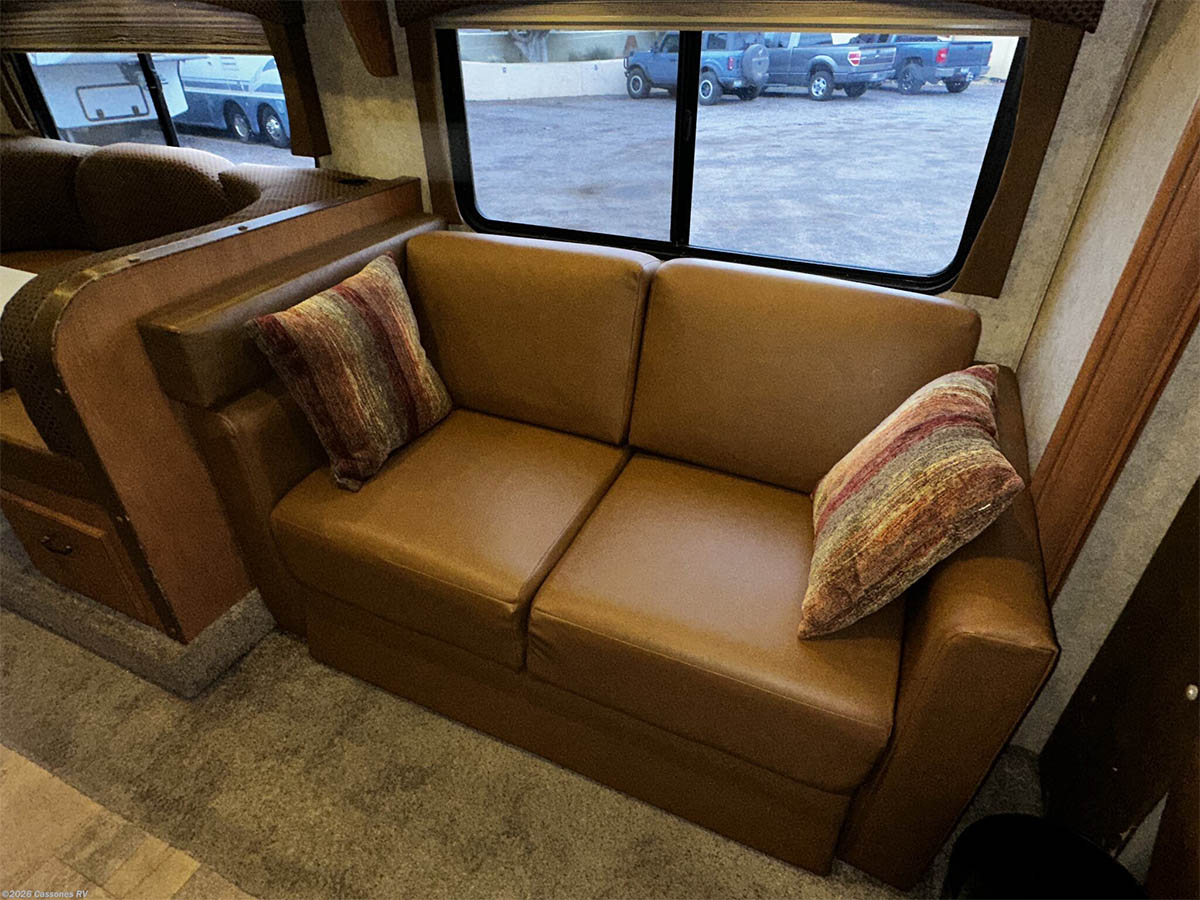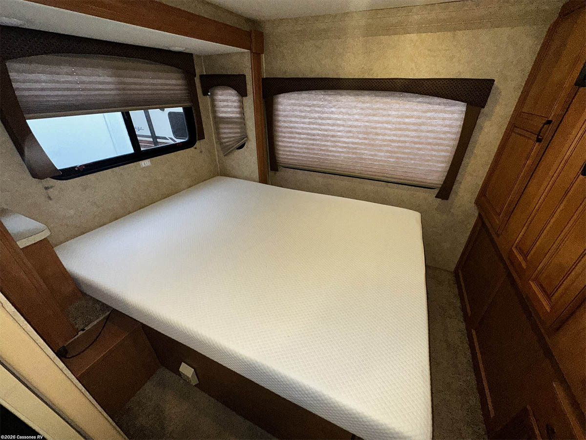 Inside, the dual-slide layout creates a bright and functional living area with cab-over sleeping, modern interior finishes, and LED lighting throughout. Entertainment is handled by a touchscreen AM/FM/CD/DVD stereo with Bluetooth, USB, AUX input, and weather band.
