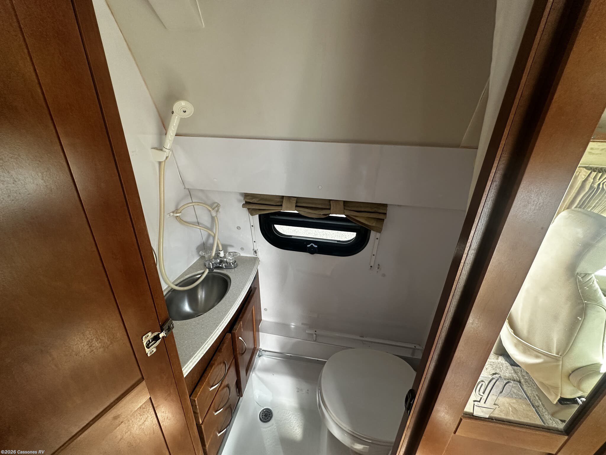 Across from the kitchen is a fully enclosed wet bath with shower, toilet, and vanity, a feature that many travelers appreciate for the convenience and privacy it provides in a compact motorhome.