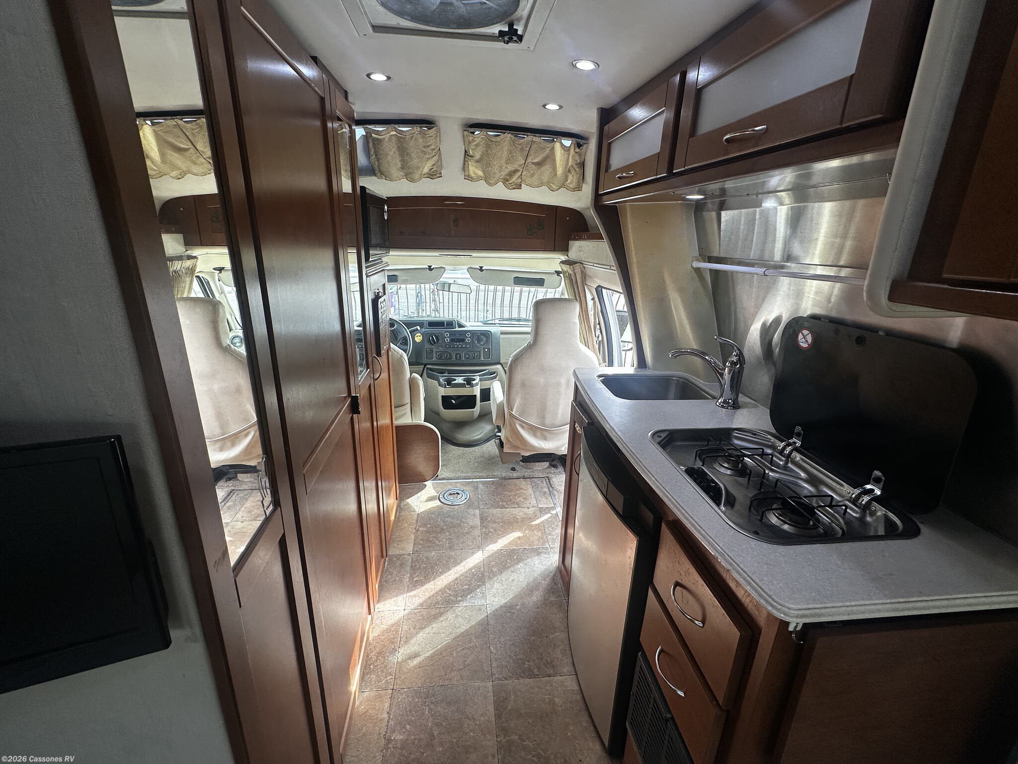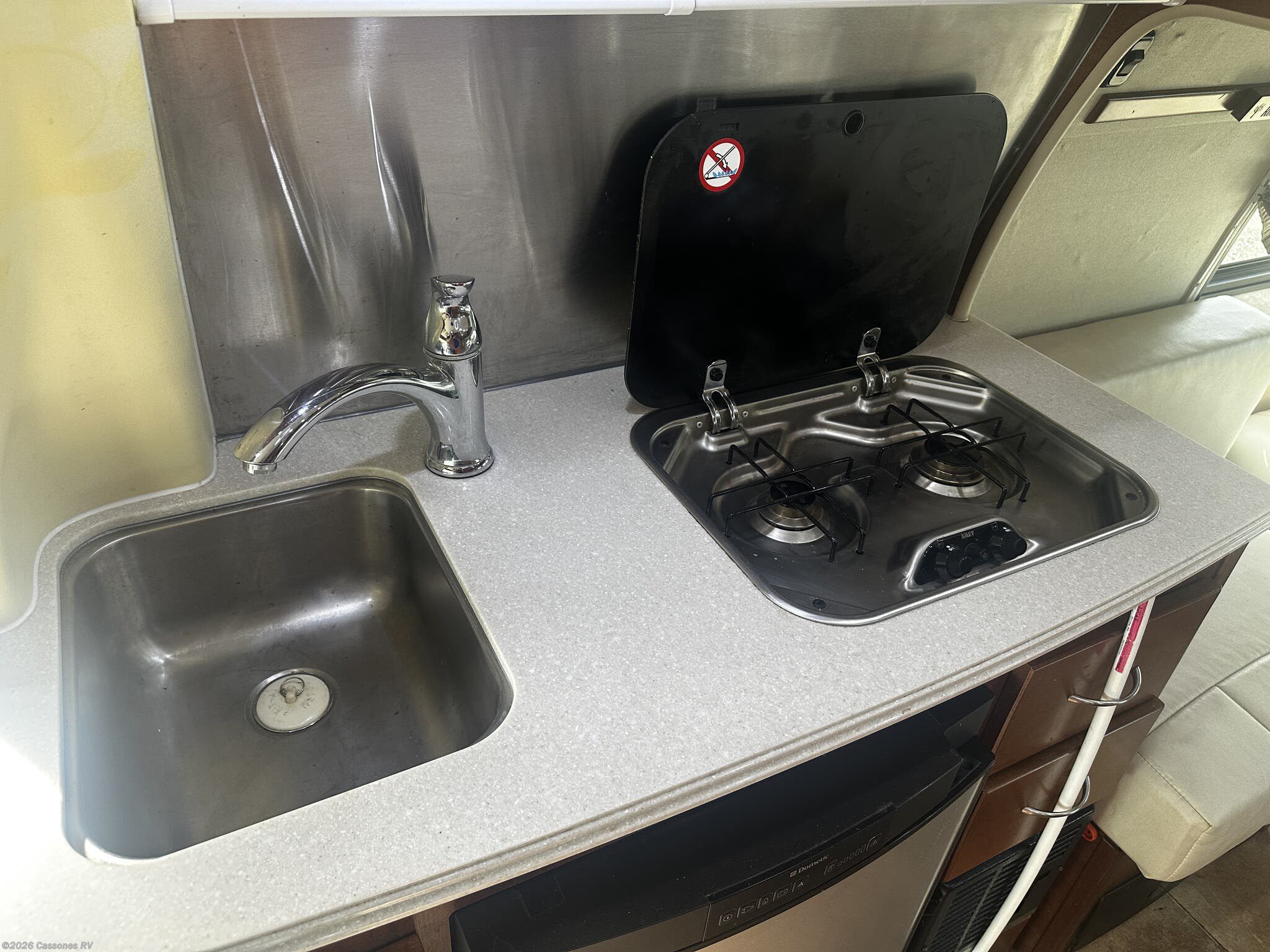 The well-equipped galley kitchen includes a two-burner cooktop, microwave oven, refrigerator/freezer, stainless sink, and generous cabinet storage, making meal preparation easy whether you’re on the road or at the campsite.