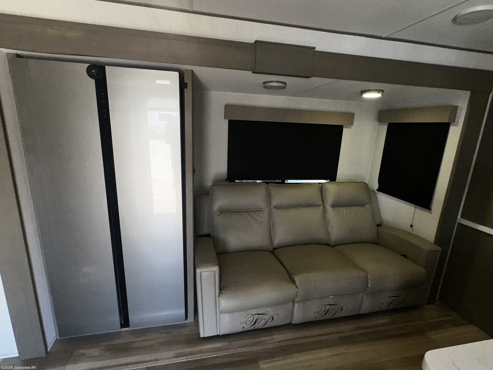 Moving into the living area, you’ll find opposing slide-outs that create an open residential living room, complete with theater seating, a tri-fold sleeper sofa for guests, and an entertainment center with a large LED TV and fireplace. Oversized panoramic windows bring in natural light and provide great views wherever you’re parked.